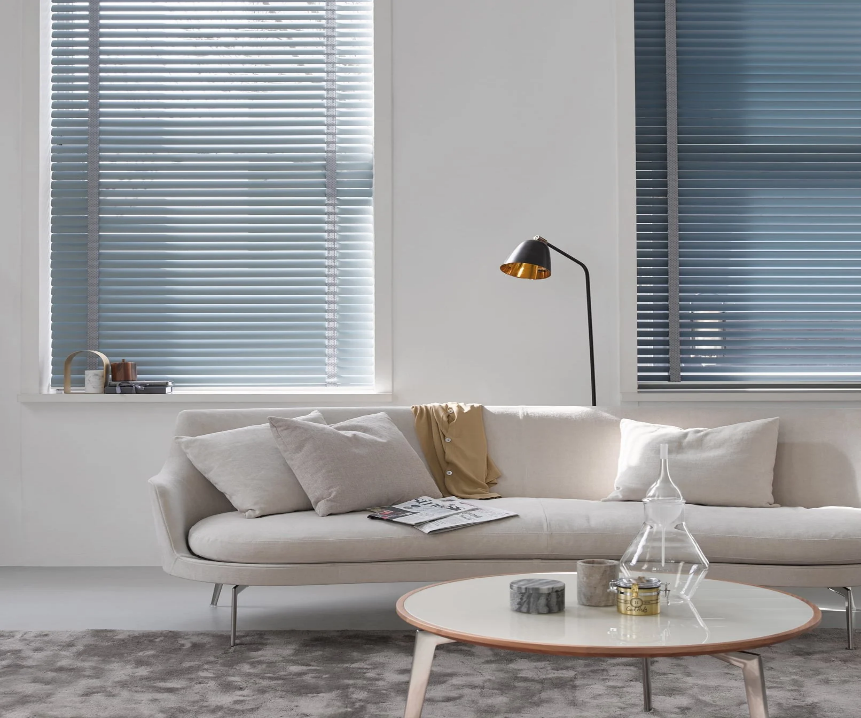 The slats in the Silk Twin Ventian blinds series create harmonious plays of colour at the window in their Scandinavian-style smoky hues: from vibrant lilac to dusky pink and taupe right through to blue. This visual highlight is created by the different colouring on the front and back of the Venetian blind slats. The backs are each designed with a slightly lighter or darker shade from the same colour family so that when the slats are tilted, a lighter steel blue appears instead of a dark smoky blue.