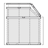 This ceiling blind is the ceiling window version of P1637, with additional steel wire tension cords to keep it taut even in a horizontal position. It has a stationary lower rail and is operated via a narrow adjustable upper rail. Additional stationary rails are mounted on each slanted side for extra stability. Because the adjustable upper rail has a width of 70 mm, a small gap will remain at the top of the window when the blind is closed.