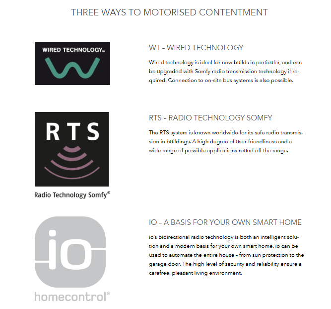 With Somfy’s versatile hardwired AC electric motors using 230v & low voltage DC 24v & 12v motors (wireless technology), motor drives, and control options, we offer you exactly the right technology for your needs and rooms. From wall switches to bidirectional radio controls as the basis for your smart home – also ideal for sun protection systems, which are large or difficult to access – without annoying cords or chains