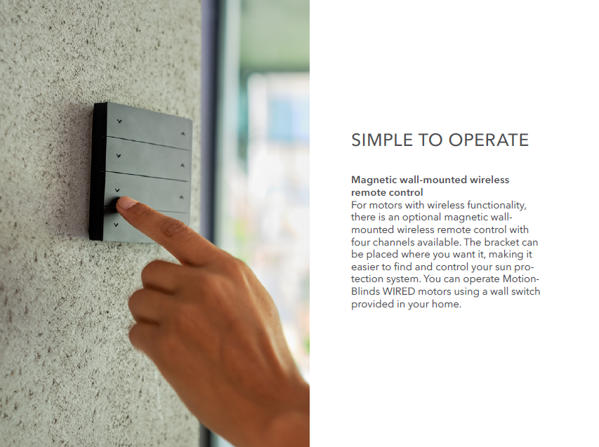 - Powered by MOTIONBLINDS: 12v Battery-powered motors or hardwired 230v AC and low voltage 12v DC motors (wireless technology)