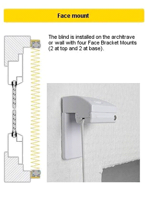 The information below briefly describes each of the mount types and the hardware fixings available for each of these methods. If you are uncertain about the suitability of any mounting hardware for your windows, we recommend ordering and testing one or several mount fixings here before ordering your blinds. We are also happy to provide advice over the phone or by email. Face mount with Face Bracket Mounts for adjustable blind rails (left) and Face Brackets plus Fixing Clips for stationary blind rails (right).