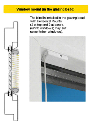 - Glazing Bead Mounts – sit on the glazing bead, by attaching to the vertical (room-facing) side of the glazing bead. (Stationary upper rails are attached by additional Fixing Clips).