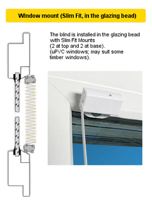 - Slim Fit Mounts – sit in the glazing bead, and are specifically designed for very narrow glazing beads; the blind is mounted slightly away from the glass to avoid the blind fabric sliding against the glass. Not suited to blinds with fixed rails. Some timber windows may be suited to Slim Fit Mounts).